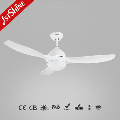 白いランプのシェードで現代的なライトを備えています. リバーシブルな刃がリモコンで多くの空気流を生み出します.