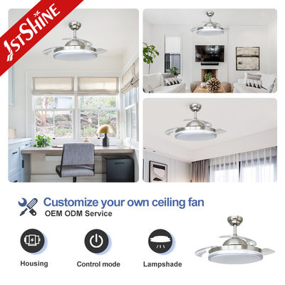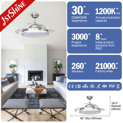 引き下げ可能な天井扇風機,開けると直径42インチ,折ると直径21インチ. 3つのアクリルブレッドは自動的に拡張し引き戻します. 3つの扇風機速度とLEDライトは,1つのリモコンで制御できます.